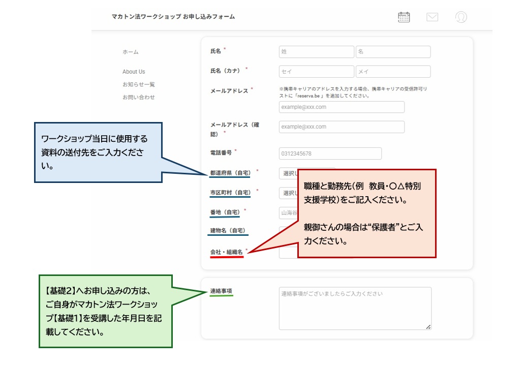 また、以下の通り、 “都道府県(自宅)”~“建物名(自宅)”の欄に、ワークショップの当日に使用する資料の送付先のご住所を入力してください。“会社・組織名”には、職種と勤務先(例:教員・〇△特別支援学校)をご入力ください。親御さんの場合は、“保護者”とご入力ください。 【基礎2】を申し込まれる方は、申込みフォームの“連絡事項”の欄に、ご自身がマカトン法ワークショップ【基礎1】を受講した年月日を記載してください。※【基礎2】は【基礎1】を受講された方のみ申し込みができます。