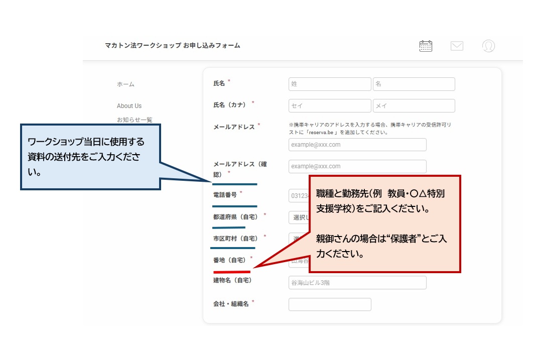 また、以下の通り、 “都道府県(自宅)”~“建物名(自宅)”の欄に、ワークショップの当日に使用する資料の送付先のご住所を入力してください。“会社・組織名”には、職種と勤務先(例:教員・〇△特別支援学校)をご入力ください。親御さんの場合は、“保護者”とご入力ください。